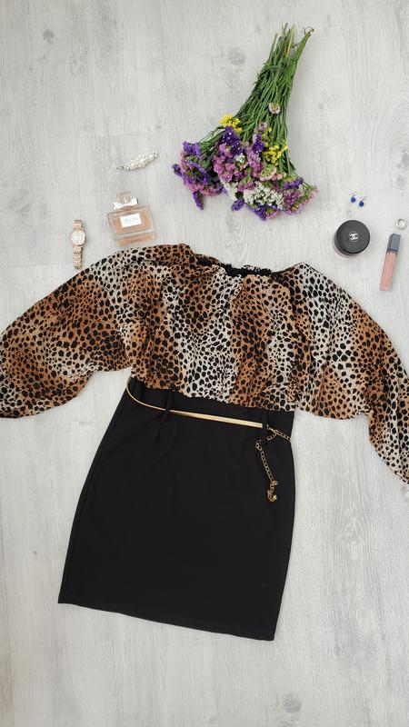 Плаття з тигровим принтом, підійде на якусь подію, коли не жарко. Верх тигровий колір, тканина шифонова, а низ чорного кольору, йде як пряма спідниця. в комплекті є золотий поясок Довжина 75 ширина низ 42 рукав ширина 24, довжина 53