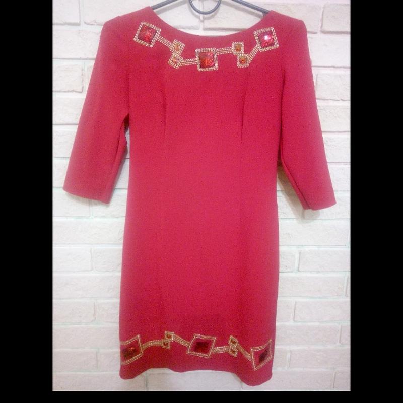 Плаття червоного кольору в дуже хорошому стані, низ та верх оздоблено золотою вишивкою, стрейч, рукав тричетверть.
