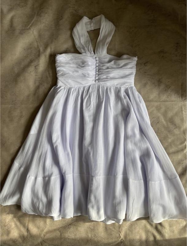 Плаття з відкритими плечами та спідниці сонце-кльош. Склад тканини 67% сотон та 33% шовк. Має кармани. Дуже легеньке, не зважаючи на великий об’єм тканини. Колір свтло фіолетовий. Можна вдягати як святкове так і щоденно. Розмір S