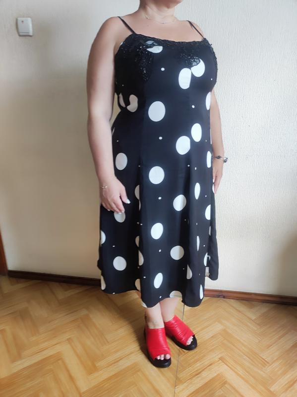 В ціну входит оплата сайту . Стан дуже гарний , без дефектів. Тканина тонка, не а складу ( схоже на віскозу , на подкладі, не тягнеться. Кольор як на фото , чорний у горох білий Размер 46 по замірам дивіться брітелі регулірутся. пог 54-55см пот 50 см поб 70 см довжина по боковому шву 92 см