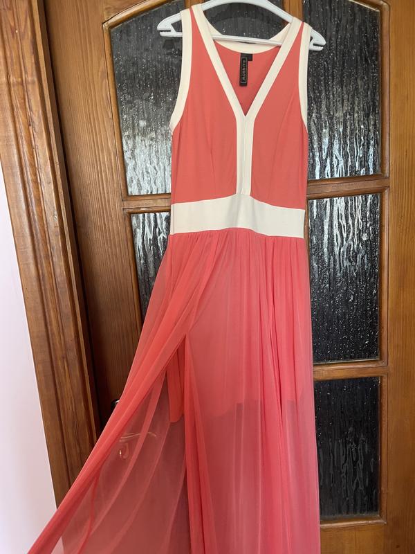 Сарафан, коралового кольору, сітчаста легка спідниця, з розрізами на обох ногах, під низом трикотажна коротка спідниця по фігурі