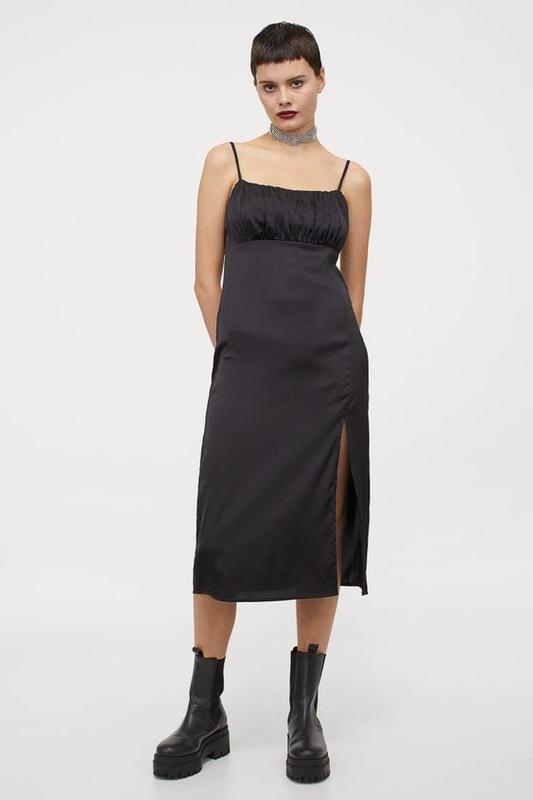 Облегающее платье длиной до середины икры из слегка эластичной ткани из переработанного полиэстера. Модель на тонких регулируемых бретелях и легкой драпировке на груди. Высокий разрез спереди и потайная молния сбоку. Состав: полиэстер 95%, эластан 5% Размер 34