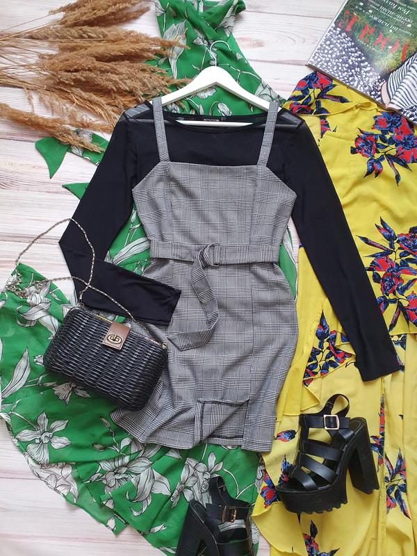 Приталений сарафан під сорочку в клітинку з поясом та розрізом