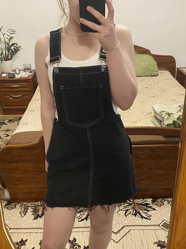Чорний джинсовий комбінезон(сарафан) з білими швами. По фасону це спідниця. Кучки регулюються по довжині. Має одну величну кишеню з переду на грудях, дві менші по боках, та дві з заду. Не носила жодного разу, без жодних дефектів. Довжина 61 см не враховуючи лямки Ширина 49 см Щоб уточнити деталі пишіть))