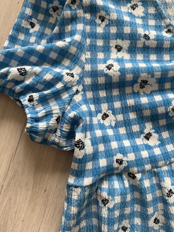 Літнє платтячко красивого блакитного кольору, з білою клітинкою та квітами. Довжина до коліна (якщо вдягати на зріст 170 см). В ідеальному стані, недоліки відсутні