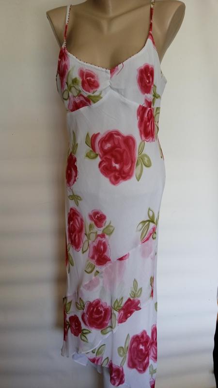 на білому фоні гарні троянди,довжина по бічному шву від пахви до низу 110,пог50,півобхват в поясі48-50,бедра56-60см, стан дуже хороший,тканина тягнеться,по верху розшито бісером,річ нарядна