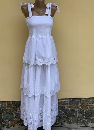 Новое длинное платье сарафан, по воланам в низу прошва ,верх полностью на резинке, длина регулируется завязками 130-, 135см, грудь 90-95см, бёдра 115см