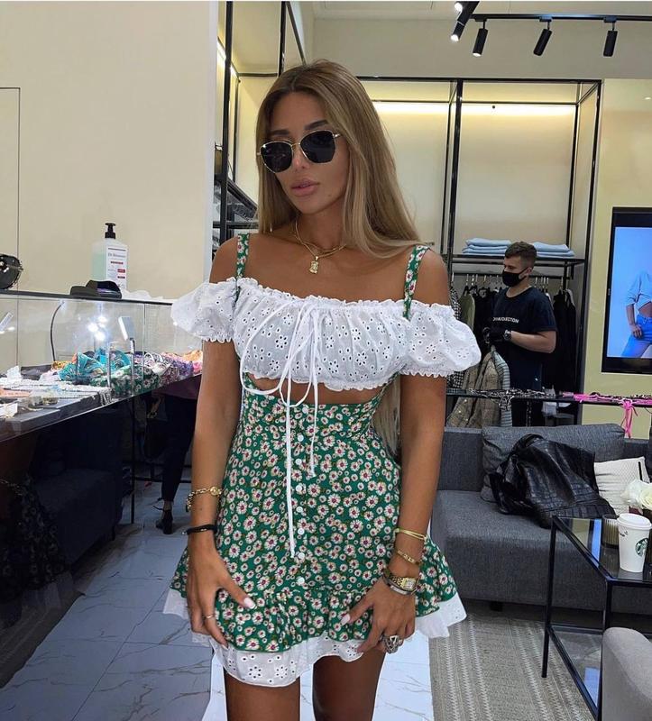 Сарафан + топ Мод: 554 Тканина: софт принт + прошва Размеры: 42-44, 46-48 Цвет: зеленый + белый Хорошее качество. 🏷Цена: 790 грн Сарафан на ругающих бретелях. Топ на резиночках. син1486