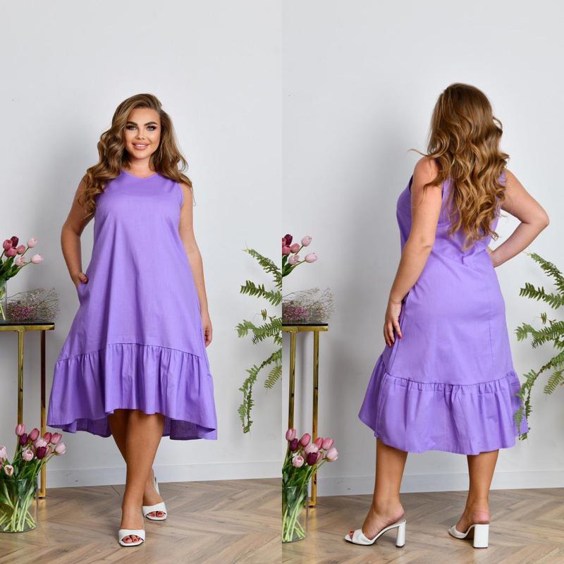 Сарафан НОВИНКА Код 3658 фил Тканина: натуральний льон 100%. Колір: ліловий, хакі, блакитний, джинс, пудра, т.синій, фісташка, капучіно, шоколад, зелений, гірчиця, ментол, білий, яскраво-синій. Розміри: 52-54, 56-58, 60-62, 64-66. Довжина сарафану: 109/119, 109/119, 110/120, 110/120 см. Заміри готового виробу: 52-54 ОГ 108 ОТ 120 ОС 140 56-58 ОГ 116 ОТ 128 ОС 148 60-62 ОГ 124 ОТ 136 ОС 156 64-66 ОГ 132 ОТ 144 ОС 164 Стильний літній сарафан із натурального льону (розтяжність середня). Сарафан має А-подібний силует, низ декоровано воланом. Виріз горловини круглий. В бічних швах оброблені кишені. Застібок немає. Сарафан чудово маскує усі особливості фігури, та візуально робить стрункішим силует. Ідеальний варіант на літні спекотні дні.ск3.Не натискайте на кнопку Купить, не дізнавшись за наявність товару.Підписуйтесь.чекаю)Читайте розділ про мене)
