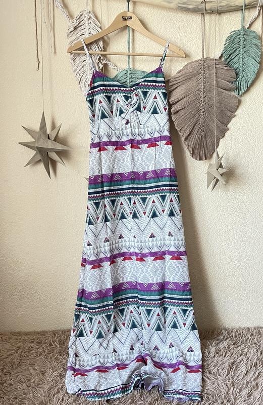 зручний та приємний до тіла сарафан стан ідеальний, але має незначний, непомітний дефект за рахунок забарвлення (останнє фото, між грудьми є резинка і на ній цей дефект) на спинці резинка склад 100 віскоза розмір С, можна на М, орієнтуючись на заміри довжина 138см пог 35-42см пот до 100см, вільно пос вільно до 56см)