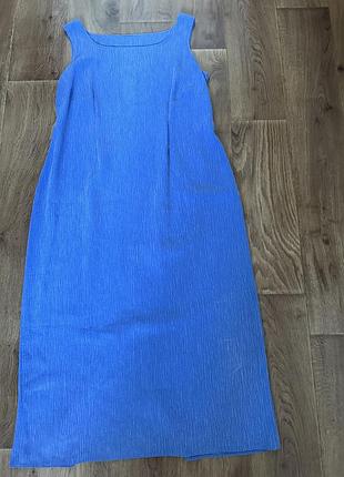 Продам гарний літній сарафан міді. Колір блакитний. Стан ідеальний. Тканина не просвічує, приємна на дотик. Плюс сарафану що його не потрібно прасувати ) Підійде як на кожен день так і подію, під будь яке взуття. Розмір L-XL, 50-52. прямого крою, злегка приталений. Заміри: довжина виробу 115 см, довжина плеча 6 см, полуобхват грудей та талії 50 см, бедра 60 см, ззаду невеликі розріз.