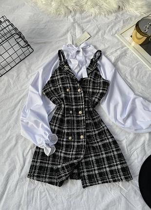 Комплект - 2ка з брошкою💎 Розміри: 42-46. Тканина: Твід + Софт(Брошка як на фото)✨ Колір: Чорний+білий. Ціна: 1299 грн🏷 📌Довжина сарафана 80 см.