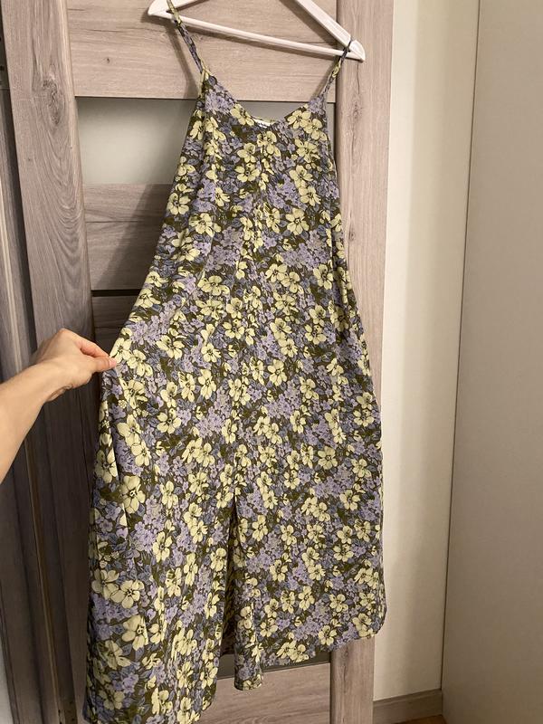 літній сарафан тканина поліестр не мнеться, на тілі не відчувається взагалі, не жарко розмір вказано L/XL, та в мене м, сидить комфортно бретелі регулюються по довжині стан ідеальний без нюансів