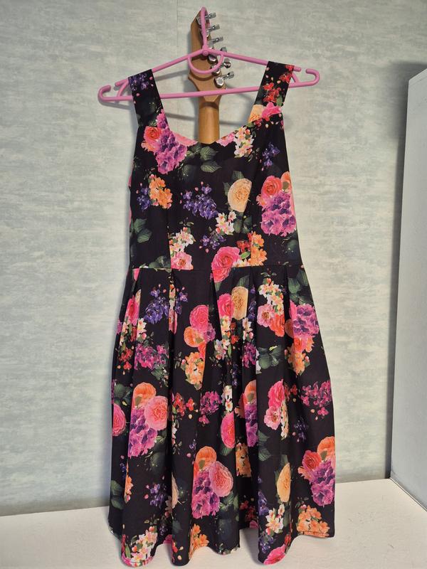 Тоненький сарафан з яскравим принтом, стан ідевльний (не носився), матеріал - поліестер, півобхват грудей 45см, талії - 41см, вказаний 44 розмір, але краще на M, трохи тягнеться, можна на вагітність, бо багато місця для животика