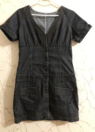 Плаття-сарафан джинсовий. Щільний, злегка тягнеться. Добре сідає на фігуру. Красиво сформована зона декольте. Бирки зрізані. Розмір вказаний 42( наш 50). Дивіться заміри на фото. Торг!