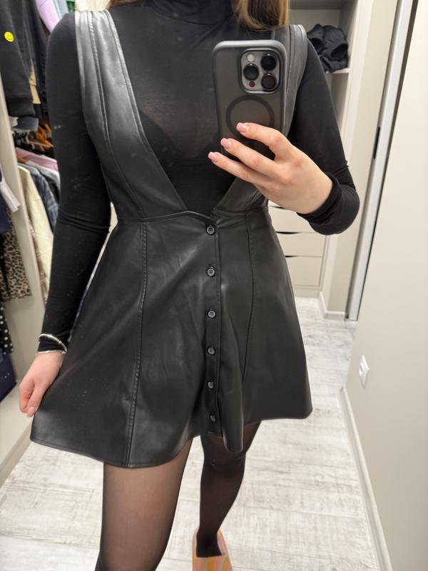 Сукня-сарафан з еко-шкіри чорного кольору. Вказаний розмір — S, але підійде і на M. На фото — зріст 165 см, на вищий може бути коротшим . Стан відмінний, одягалась лише кілька разів.