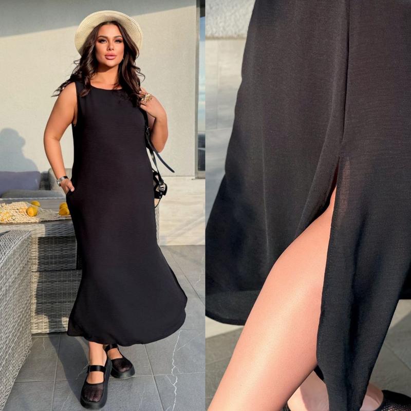 🤩Сарафан Модель: 194 🌹Розмір: 48-50, 52-54, 56-58 Колір: блакитний, малина, чорний Тканина: креп жатка Яскравий, легкий, стильний сарафан виготовлений з американського крепу жатки, приємна до тіла тканина, не парить. Прямий крій та вільний сілуєт. Діючи кишені, з боків розрізи. Ідеально підходить під будь-яке взуття. ⭐️Виміри⤵️: 💙48-50 Обхват грудей 104 см Обхват стегон 120 см Довжина виробу 127 см 💙52-54 Обхват грудей 114 см Обхват стегон 130 см Довжина виробу 127 см 💙56-58 Обхват грудей 124 см Обхват стегон 140 см Довжина виробу 127 см