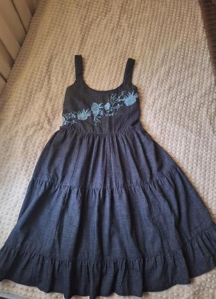 Легкий, вільний, ярусний сарафан,синьо-сірого кольору, виглядає як джинс, але ні), в складі льон,віскоза,прикрашений вишивкою, розмір 12(46) стан ідеальний. Заміри: довжина 97см., ПОГ 46см., під грудьми ПО 42см. далі вільно.