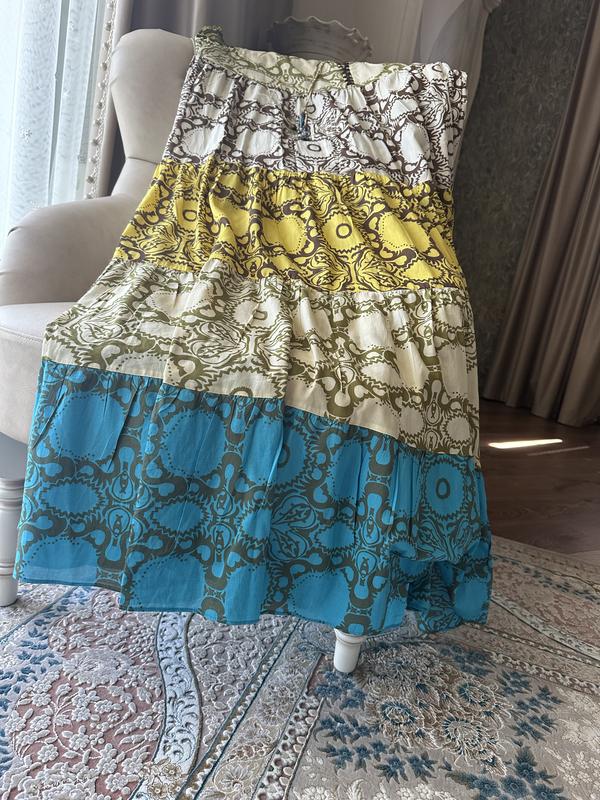 Зара сарафан из тончайшего невесомого хлопка. Многоярусный, в стиле печворк. Провязанные крылышки на руковах и горловине. Красивые композиции из бисера на веревочках от воротника. Размер с- м. Свободно от тела ог 55-56; длинна 128 см