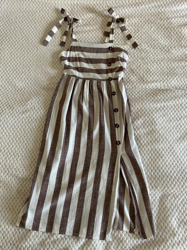 Розмір S Сарафан в ніжно коричнево білу смужку Довжина 91 см Напівоб’єм грудей 37 см Напівоб’єм талії 34 см Виріз 37 см Прилягає до грудей і талії далі йде вільно спідницею