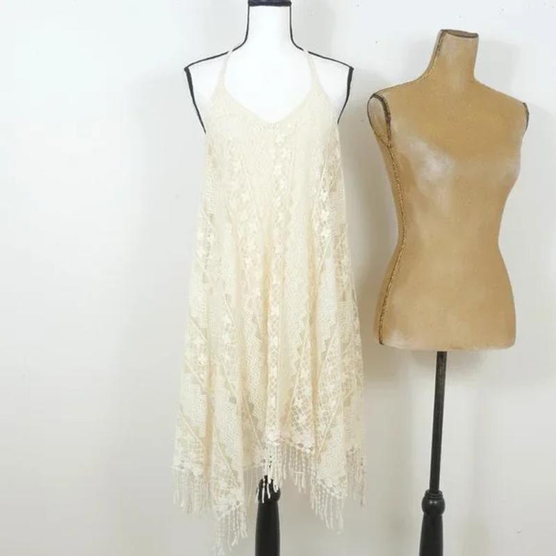 Платье, сарафан сливочного цвета от люксового модельера Anna Sui. Изготовлена из кружева, имеет трикотажную подкладу такого же кольра. Модель расклешенная с бахромчатым асимметричным низом. Стан идеален. Размер по набору L. Замеры: под руками - 44см, бедра - 46см, длина без бретель - 85см.