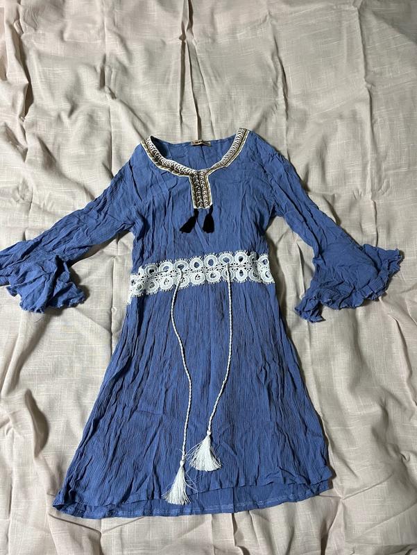 Блакитна легка сукня на літо. Має розкльошені рукави по лікті. Біла мереживна обробка з поясом з китицями