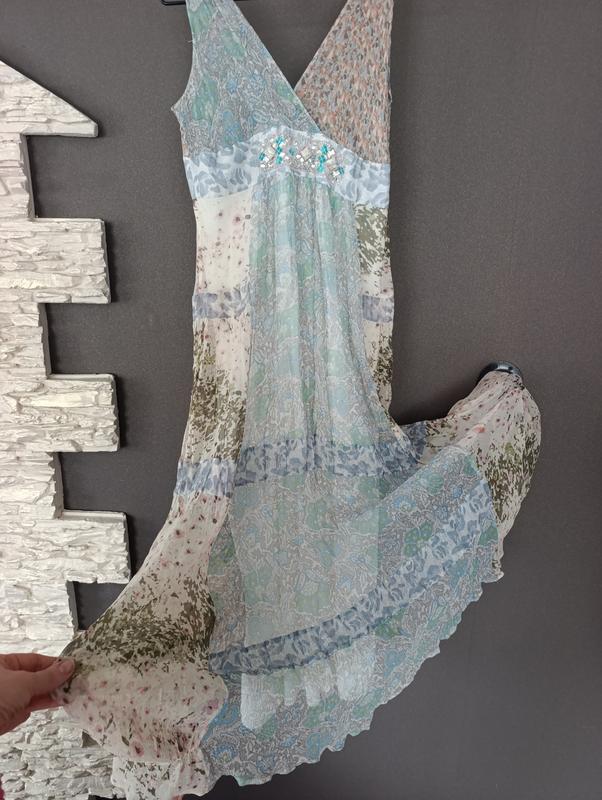 Пог-40, Поб( під кокеткою)-40-41, довжина сарафану від плеча 128 см. Бренд EVONA,вказує розміри42, але фактично він 38-40. Летюча тканина 100% шелк. Дуже ефектний літній сарафан.