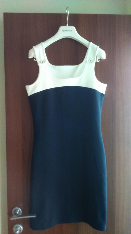 Гарний святковий сарафан,синій з білим, замовлявся по каталогу Otto в Угорщині.Дуже вдала модель,до колін. На зростання 1,58-1,60. Без всяких вад і дефектів.