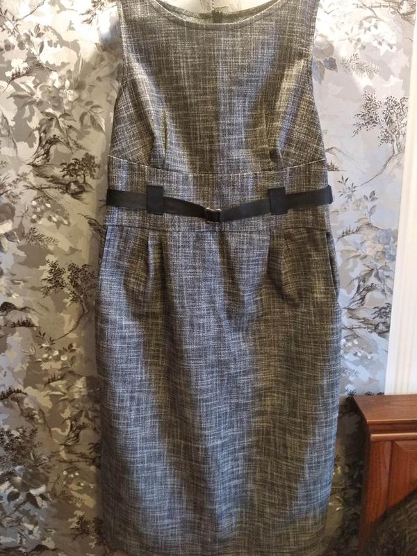 Плаття-сарафан сталевого кольору, застібається на змійку (на спині). Можна носити як плаття, а також із гольфом, сорочкою в прохолодну погоду. Якісна тканина. Чудовий варіант для прогулянок та офісу. В ідеальному стані. Розмір по бирці 42 (тілочковий). Заміри: ПОГ-42 см, НОТ-37 см, НОС-45 см, довжина — 100 см.