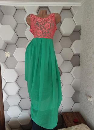 Очманілий дизайнерський сарафан Nikolo Polini. Шифонова спідниця з под'юбніком ззаду зав'язки пояс. Верх із мережива. Застібка прихована блискавка збоку. Розмір європейський 42. Довжина 150см, ОГ 88. під пахвами напівобхват 46. Талія напівобхват 40тчгнеться до 55.