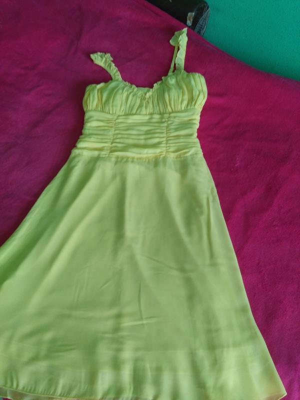 дуже красиве, жовтий колір в житті дуже красивий, дуже красиво виглядає в області декольте. Купувала в BONPRIX. Жодного разу не наділа. Довжина від талії приб. 60 см, ПОГ 39 см, ПОТ 34 см, не тягнеться. В області декольте щільна тканина з підкладкою, можливо носити без бюстгалтера. Спідниця теж з підкладкою