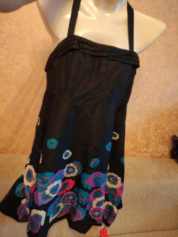 Сарафан красивий новий розмір указан14, але мені здається маломерит підійде на с-м, дивіться заміри, тканина не тягнеться Бретельки на гудзиках, можна робити навхрест. Тканина 100%шовк. Збоку на блискавці Довжина без бретелек70 З бретелями91 Пог44 Піт 40 Побіди 60, вільні