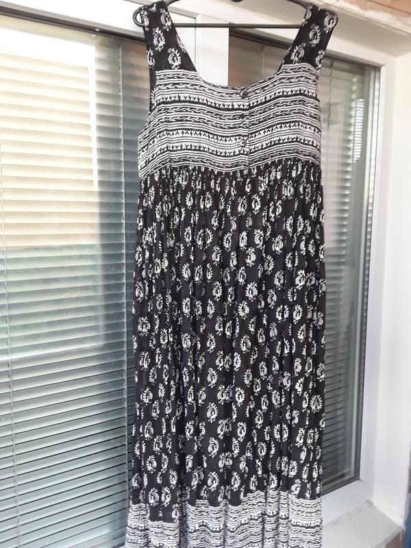 Тонкий легкий сарафан, кокетка на пуговицах, талия завышена, на сборке. Ориентируйтесь по замерам. Длина 124, пог 50, высота кокетки от плеча 32, ПО под кокеткой 49. Новый, с этикеткой.