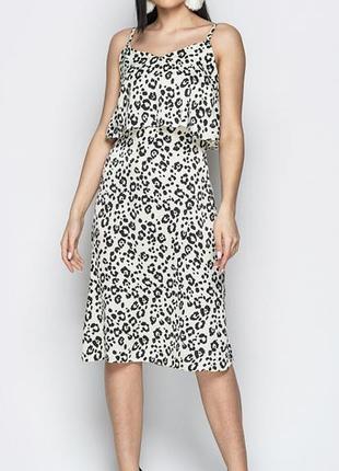 Шикарне плаття-сарафан молочного кольору з твариною принтом. Тканина дуже приємна на дотик, нагадує шовк. Підійде на невеликі груди. ОГ - 90 см. ОТ - 82 см. ОБ - 103 см. Ширина по низу - 142 см. Довжина з урахуванням бретелей - 110 см.