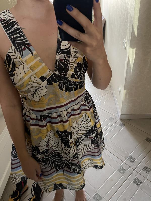 Класне плаття, з оригінальною спинкою У вас вийде здивувати ним) Одягнене 1 раз, практично нове Квітковий принт з люрексною ниткою Об‘єм в грудях до 100см Довжина 92 см Півоб‘єм під грудьми 37см Наложки нема