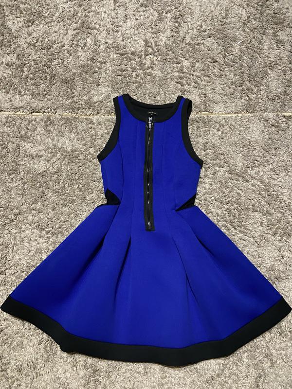 Чарівне, оригінальне плаття в гарному кольорі електрик. На талії по бочках вставки з прозорої сітки(на фото видно). Виконано з щільної і в теж час м'якої тканини, низ тримає форму. Розмір вказаний на бирочке.