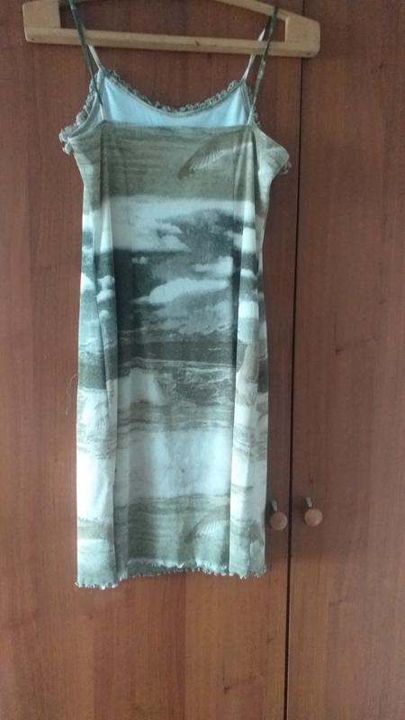 Легенький сарафан з найтоншої тканини на підкладці. Тканина злегка тягнеться. Верх сарафана декорований оборкою. Підкладка в одному місці з плямами. вони не видно через тканину. Довжина сарафана 70 см ПоГ 42,Піт 39,Побіди 50