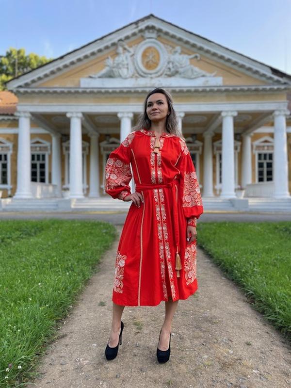 Яскрава нарядна сукня з розкішною вишивкою. Йде на параметри 42-44. Індивідуально заміри зроблю, звертайтесь. На зріст 168, як на фото, буде міді.
