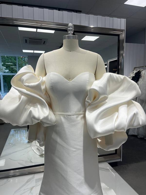 Зшито на параметри90-76-98 і на ріст 167+ висота каблука 6 см( всього 173 см) є невеличкий блок на кінці «хвоста» який залишився після хімчистки. Кольорову айворі