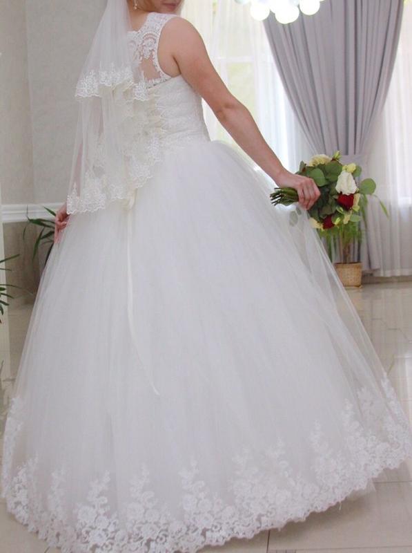 Весільна сукня кольором Айворі , дуже гарне, на карсете красиве мереживо з палетками і є шикарний бантик , ззаду красива спина, застьожка гудзики і замочок знизу а також шнурівка. Низ плаття середньої пишноты кільця на трійки чи четвірки,знизу красиве мереживо, плаття зручне, виглядає шикарно. Сукня по довжині на 1,70,плюс каблук, розмір сукні 46.Плаття нове в ідеальному стані тільки з хімчистки.