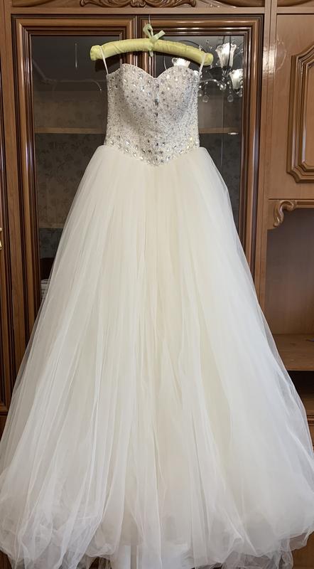 Дизайнерська весільна сукня. Весільна сукня зі шлейфом. Розмір універсальний . Застібається на приховану блискавку на спинці і регулюється стрічками - утяжкой. Довга фата (на заколках) Сукня на фігурі пишне. Довжина попереду 140 см, ззаду 170 см (від бюста) Максимально під грудьми/талія 38 см(76 см)