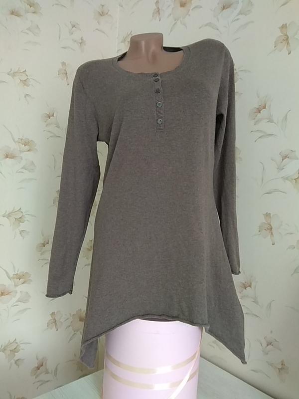 Дуже оригінальна брендовий туніка. Тонкий, ніжний трикотаж - у складі коттон і натуральний шовк. Тканина приємна до тіла. Колір дуже гарний, пастельний, сірувато-коричневий. Спереду планка на гудзиках, ущільнена тканиною, що не дозволяє розтягуватися. Напівкруглий виріз горловини ефектно виглядає. ПОГ 50 см, тягнеться. В плечах 42 см. Довжина рукава від плеча 60 см. Довжина спереду 68 см, по спинці 75 див. Збоку 84 див. В стегнах вільна. Стан ідеальний. Сліди шкарпетки відсутні. Дефектів немає.