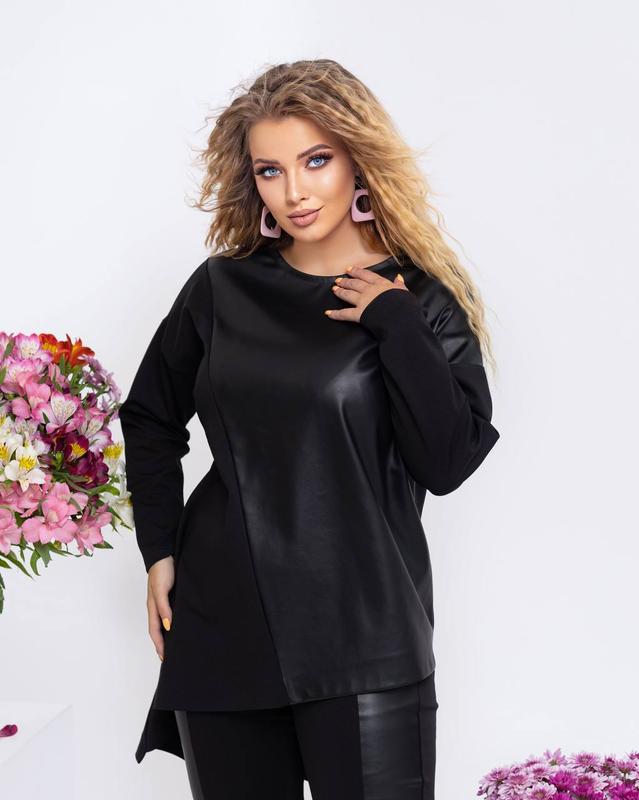 Кофта туника Номер: 2041 Цена: 760 грн Ткань: итальянский люкс трикотаж (плотный, тёплый), вставки эко кожа на тёплой основе флис Цвет: чёрный Размер: 48-50, 52-54, 56-58, 60-62 Примечание: ассиметричная туника (кофта) с плотного трикотажа, вставка эко кожа. Фасон ассиметричный сзади длиннее, спереди короче. Хорошая база так как можно комбинировать в носке с чем угодно юбка или лосины с эко кожи, лосины, джинсы или же брюки. Можно костюмом с лосинами на фото номер 2040