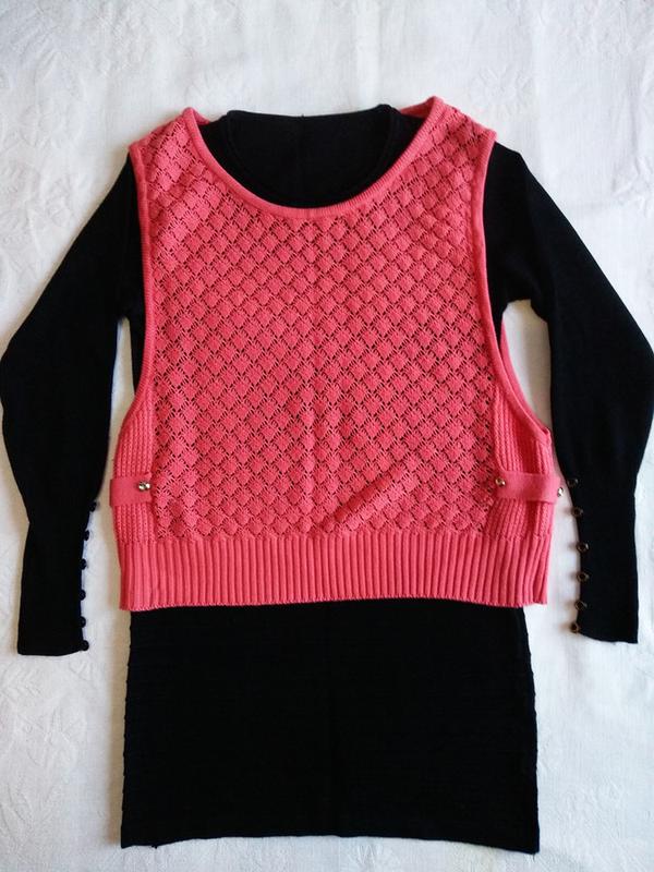 Новий, без етикетки, плаття-туніка з жилеткою, р. 44-46. Тканина м'яка, приємна до тіла. Можна окремо носити туніку (яка виглядає як облягає чорне плаття) і жилетку. Туніка: п/про грудей 40 см, п/о талії 37 см, рукав з манжетом 54 см, плече 8 см, довжина 73 див. Жилетка: довжина-51 см, ширина внизу 42 див.