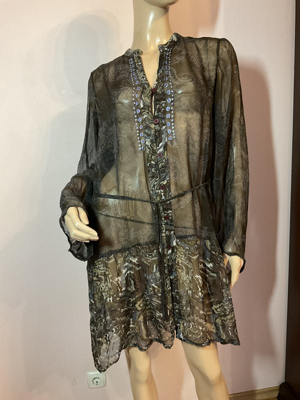 Полупрозора. Без дефектів . Заміри в грудях 64см в бедрах 63смдовжина 93см рукав 62см рукав розширений . В плечах 38см 12:1:23
