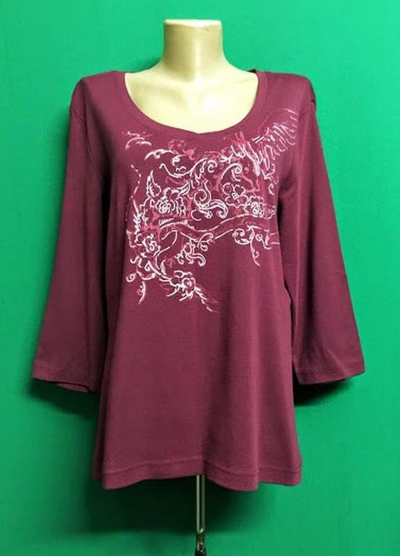 Туніка s.Oliver - 100% Бавовна (трикотаж середньої щільності, добре тягнеться) Бордова Вказано євро розмір 46, за фактом 44, наш 50 Ширина у плечах 44 см Пройм 23 Пог 56 см У таліі 51 см В стегнах 58 см Довжина рукава 45 см Довжина спинки 65 см Ідеальний як новий стан Торгу немає