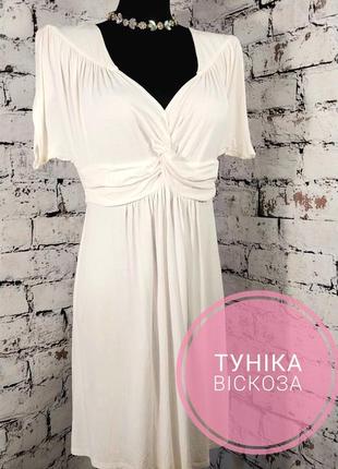 Чудова, трикотажна сукня туніка. Гарний крій. Зручна. Підкреслює бюст. Якість неймовірна: натуральна трикотажна віскоза не створює ефекту паркості і тому в ній не буде жарко. Таку туніку можно носити як пляжну, як самостійну коротку сукню, з лосинами або шортами - тобто річ універсальна. Склад: 96% - віскоза; 4% - еластан. Заміри: Довжина виробу - 90см Шир.плеч - 44см ПОГ - 44см ПОТ -42см Розмір відповідає 40/L/ 48 Достатньо добре тягнеться, підійде як на розмір менше, так і на розмір більше : M - L /46, 48, 50. Декор декольте дозволяє розмір бюсту C-D. Можна носити як оверсайз на розмір менше. Річ абсолютно універсальна, багатофункціональна, незамінна. Оплата на карту покупця. Доставка за рахунок покупця.