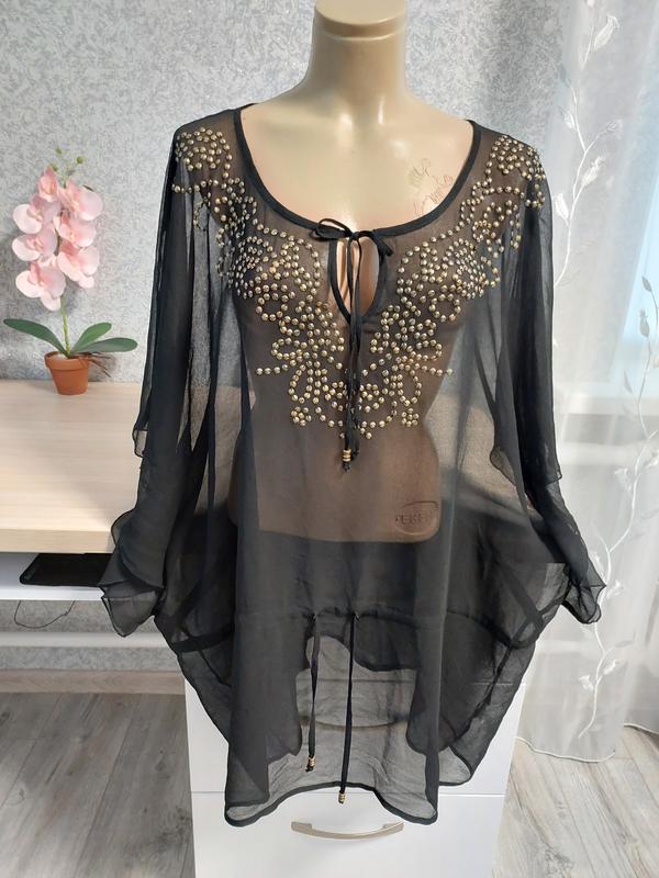 Жіноча чорна прозора туніка для пляжу,з поліестру, розміром 2XL. В ідеальному стані, усі заміри на фото. На верхніх зав'язках відсутня одна пластикова прикраса . Якість відмінна, вільного крою. Маде ін Індія.