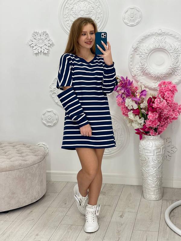Розміри - 42-46,48-52 Тканина- турецька двухнитка Пеньє ( не кашлатится, не скачується, виробництво Туреччина) Кольори- біла з чорною смугою; біла з синьою смугою; синій з білой смугою Вільна сукня-туніка , на рукавах та по низу манжети, рукав зі стильним вирізом на локті, хіт цього сезону. Параметри по зовнішньому шву виробу : 42-46: ОГ116, ОТ106, ОС108, рукав від горловини 67см, довжина по спинці 85см. 48-52: ОГ124, ОТ116, ОС119, рукав від горловини 72см, довжина по спинці 87см.