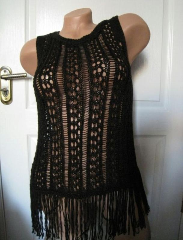 Кофтинка в гарному стані, 100% акрил. 42-46 розмір. Довжина 68 см разом з бахромою. Напівобхват грудей в нерозтягнутому стані 37-42 см, дуже гарно тягнеться.